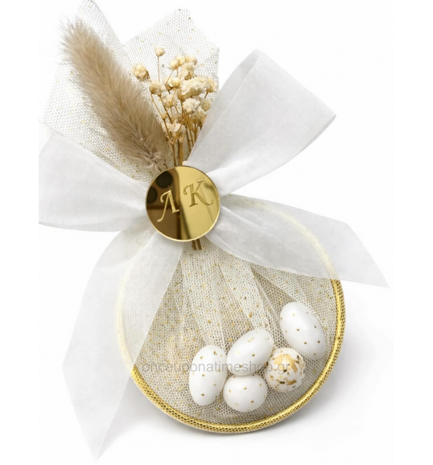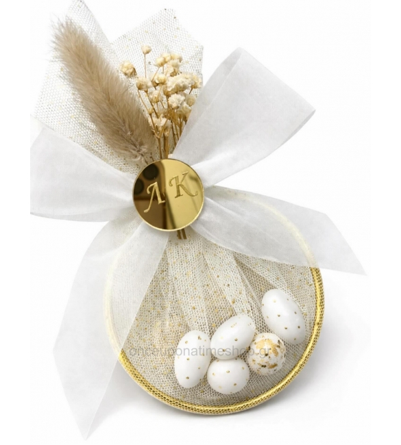 Μπομπονιέρα κρίκος με τα αρχικά του ζευγαριού σε χρυσό πλέξι.